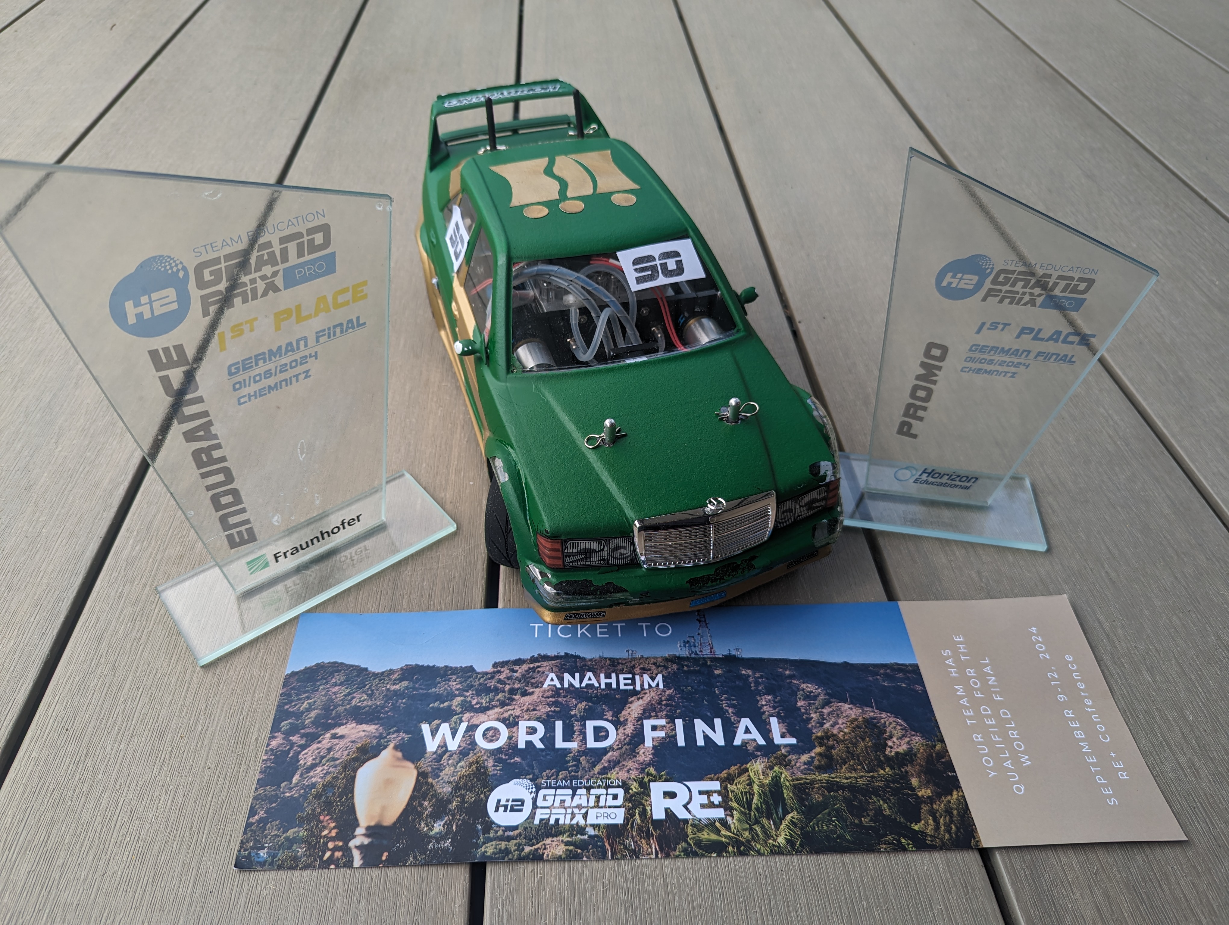 „Die Hydrogenschrauber“ - 5 Auszubildende der K21A und ihr Lehrer Daniel Rühlemann - fuhren in 680 Runden in Chemnitz ganz nach oben aufs Siegerpodest. Mit viel Spaß, noch mehr Enthusiasmus und riesigen Tüftler-Genen stellten sie sich den Deutschen Meisterschaften beim Horizon Wasserstoff Grandprix am 1.Juni 2024 im Industriemuseum Chemnitz. Nachdem die technische Abnahme der Fahrzeuge erfolgt war und einer Jury sehr erfolgreich das Auto und sein Team präsentiert wurde, ging es in das vierstündige Rennen. Elf Teams kämpften sich durch die Strecke. Boxenstopps mit Reifenwechsel, Nachtanken und schnellen Kleinreparaturen ließen eine Autorennen-Atmosphäre aufkommen, die den Puls in die Höhe trieb. Fans hinter der Boxengasse fieberten mit, die Rundenzahlen immer im Blick. Auch ein größerer technischer Defekt 15min vor Ende konnte behoben werden und der kontinuierlichen Rundenfahrt nichts anhaben. Konzentriert fokussierte sich bei allem Wettkampfgeist jeder auf seine Aufgabe. Nach dem Abpfiff wich die Anspannung der Vorfreude, die zur Siegerehrung Gewissheit wurde: Unser Team „Die Hydrogenschrauber“ gewinnt. Sie dürfen nun zum H2 Grandprix in den Niederlanden und zum World Final nach Kalifornien- was für eine grandiose Leistung. Herzlichen Glückwunsch!BSZ "Friedrich Siemens" Pirna